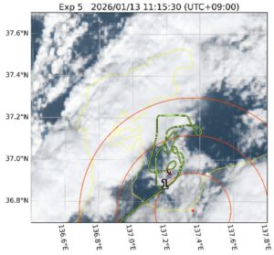 具体的な一例として、2026年1月13日のシーディング実験の様子を紹介します。この日は寒冷前線が西から迫っていました。この寒冷前線上では雷も発生しており、寒冷前線が富山湾に完全に到達する前にシーディングを実施する必要がありました。また、当該時刻は能登半島の東側に雲が生成/消滅を繰り返しており、地上班はこれから成長し、かつ、降水をもたらしうるシーダビリティの高い雲発生を予測し、航空機からのドライアイスシーディングを支援しました。シーディングの効果は、目視で判別できるものではないため、現在もプロジェクトではレーダー・ライダーなどの解析が進んでいます。